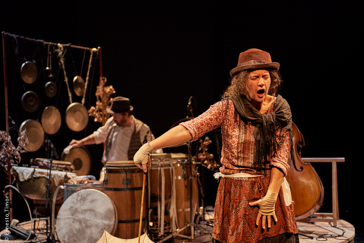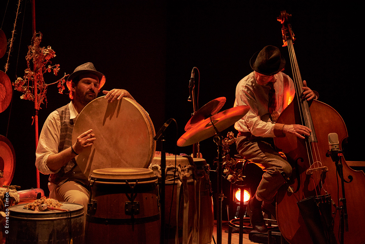 J’ai accompagné la fin de résidence de création de Vavangaz Ti Katorz, projet qui chemine à son rythme tranquille depuis toutes ces années (je vous en parlais déjà là) jusqu’à sa première vraie représentation en cet automne 2017… Incubé à la pépinière de la scène nationale d’Aubusson, il s’est finalement joué le 3 novembre sur le beau plateau de la Communauté de Communes de Bourganeuf / Royère-de-Vassivière, en Creuse. Un objet étrange et envoûtant porté par la Cie Zafèr K, concert théâtralisé où Nelly Cazal incarne la clocharde céleste Ti Katorz, dans un parlé chanté en créole réunionnais mais dont la musicalité est universelle, accompagnée de main(s) de maître(s) par Jérôme Cury aux percussions et Gaël Ascal à la contrebasse — qui créent un ilot de musique tantôt jazz tantôt chamanique tantôt contemporaine mais jamais folklorique elle non plus…